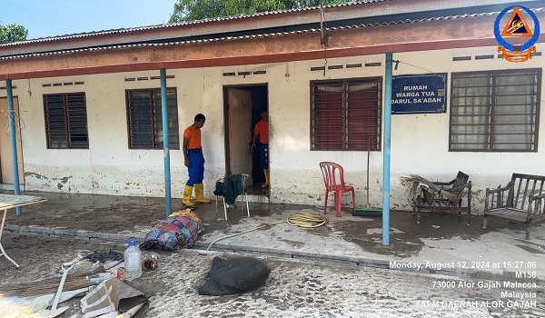 Pegawai dan anggota dari Pejabat Unit Pertahanan Awam (PUPA) Masjid Tanah bersama Pejabat Daerah Pertahanan Awam (PDPA) Alor Gajah melakukan pembersihan di rumah warga emas yang dilanda banjir baru-baru ini/ FB ANGKATAN PERTAHANAN AWAM UNIT MASJID TANAH