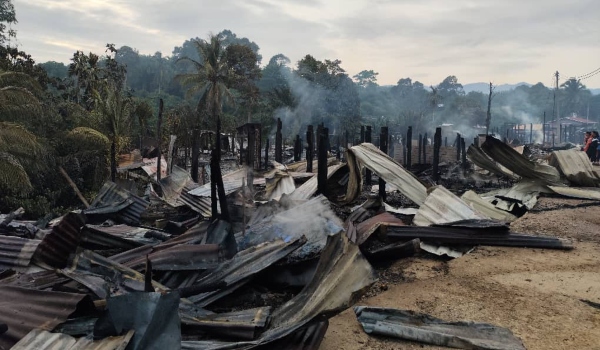 44 buah rumah musnah sepenuhnya dalam kebakaran di Kampung Penangah Tongod malam tadi/Foto Bomba