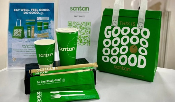 "Tentunya,kami menjual makanan di dalam penerbangan dan ini merupakan inisiatif besar yang telah diambil oleh Santan. Mereka mempunyai strategi penggantian pembungkusan selama 5 tahun.