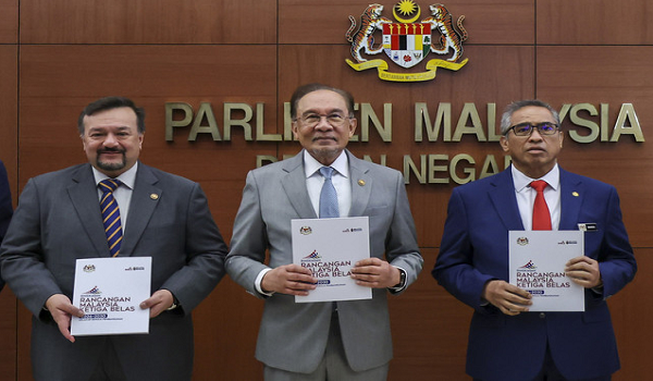 Perdana Menteri,Datuk Seri Anwar Ibrahim (tengah) menunjukkan buku Rancangan Malaysia Ke-13 (RMK13) selepas membentangnya di Dewan Negara,Isnin lalu/ Foto BERNAMA