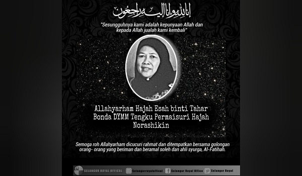 SHAH ALAM,28 September- Bonda kepada Tengku Permaisuri Selangor Tengku Permaisuri Norashikin,Esah Tahar meninggal dunia pada 5.15 pagi tadi.